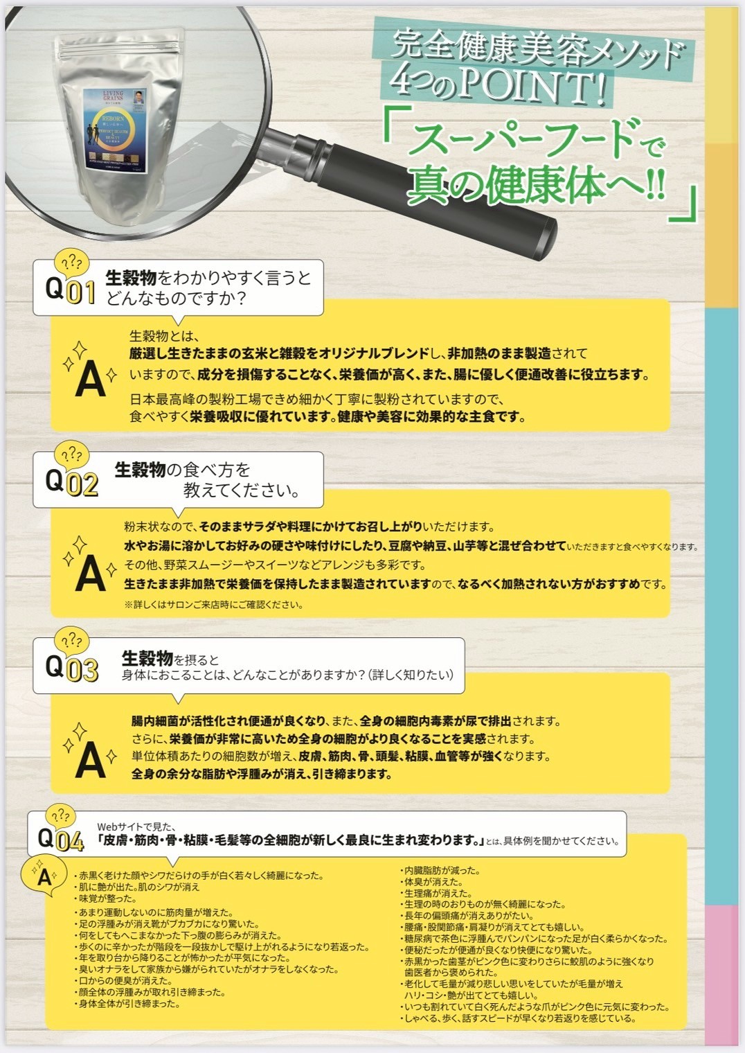 そこで大活躍しているのがオリジナルスーパーフード「生きてる穀物」です。体に最良の7種類の穀物を厳選し、日本有数の技術を持つ京都の製粉工場で、加熱せず生きたまま栄養豊富な状態で微細粉末にしています。食べやすく腸に良く吸収に優れています。腸を綺麗にしながら、最良の栄養を入れることにより皮膚、筋肉、骨、頭髪、粘膜などの細胞が新しく良く生まれ変わります。