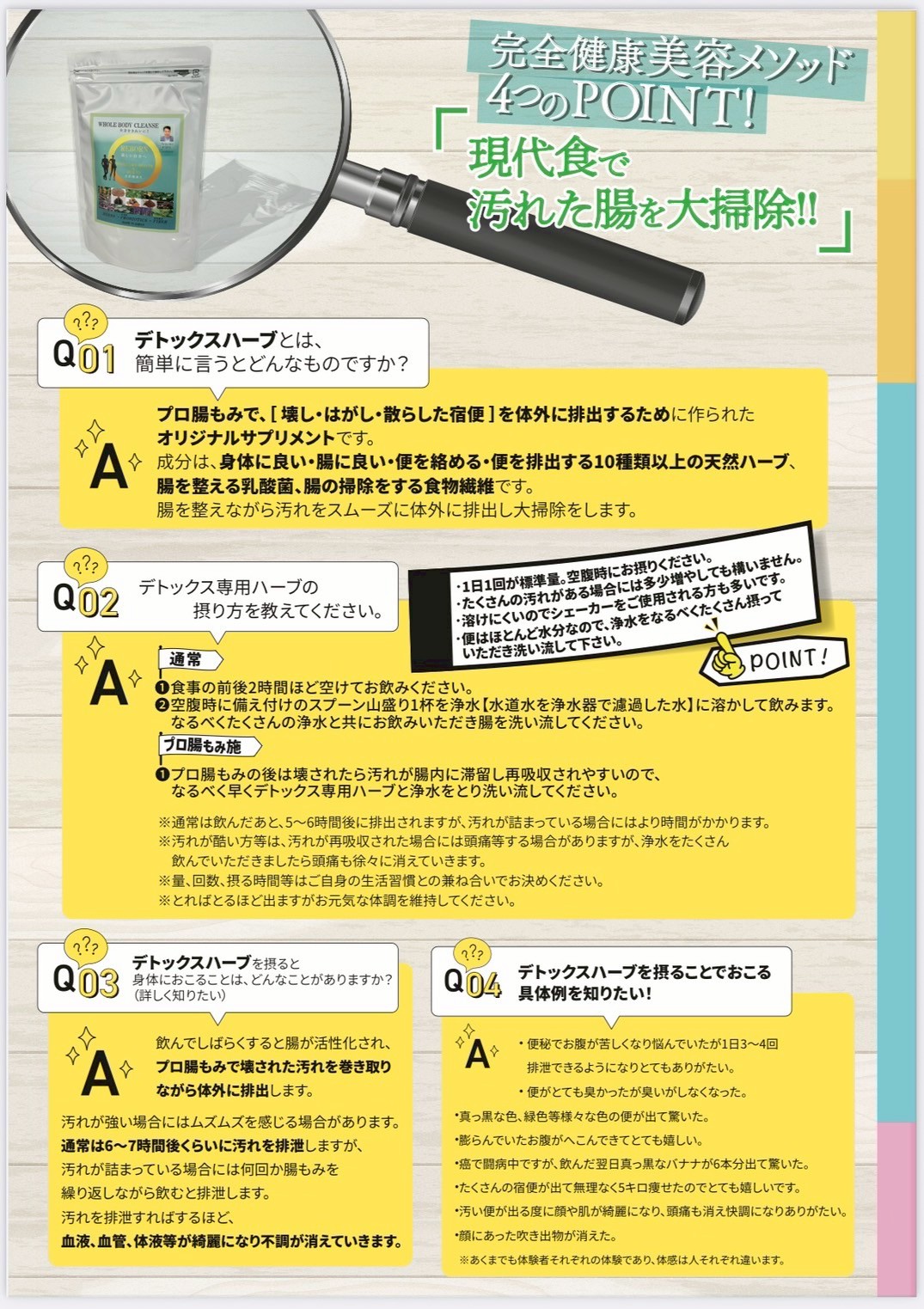 腸内のデトックスを促進するために、天然ハーブ、乳酸菌、食物繊維の入ったオリジナルデトックスドリンクで小腸の機能改善をはかり整えながら、はがれた宿便を洗い流し体外に排出させています。特別にブレンドされたハーブです。これには、体内に蓄積された老廃物や毒素を効率よく排出するための成分が含まれており、腸内環境を整えます。