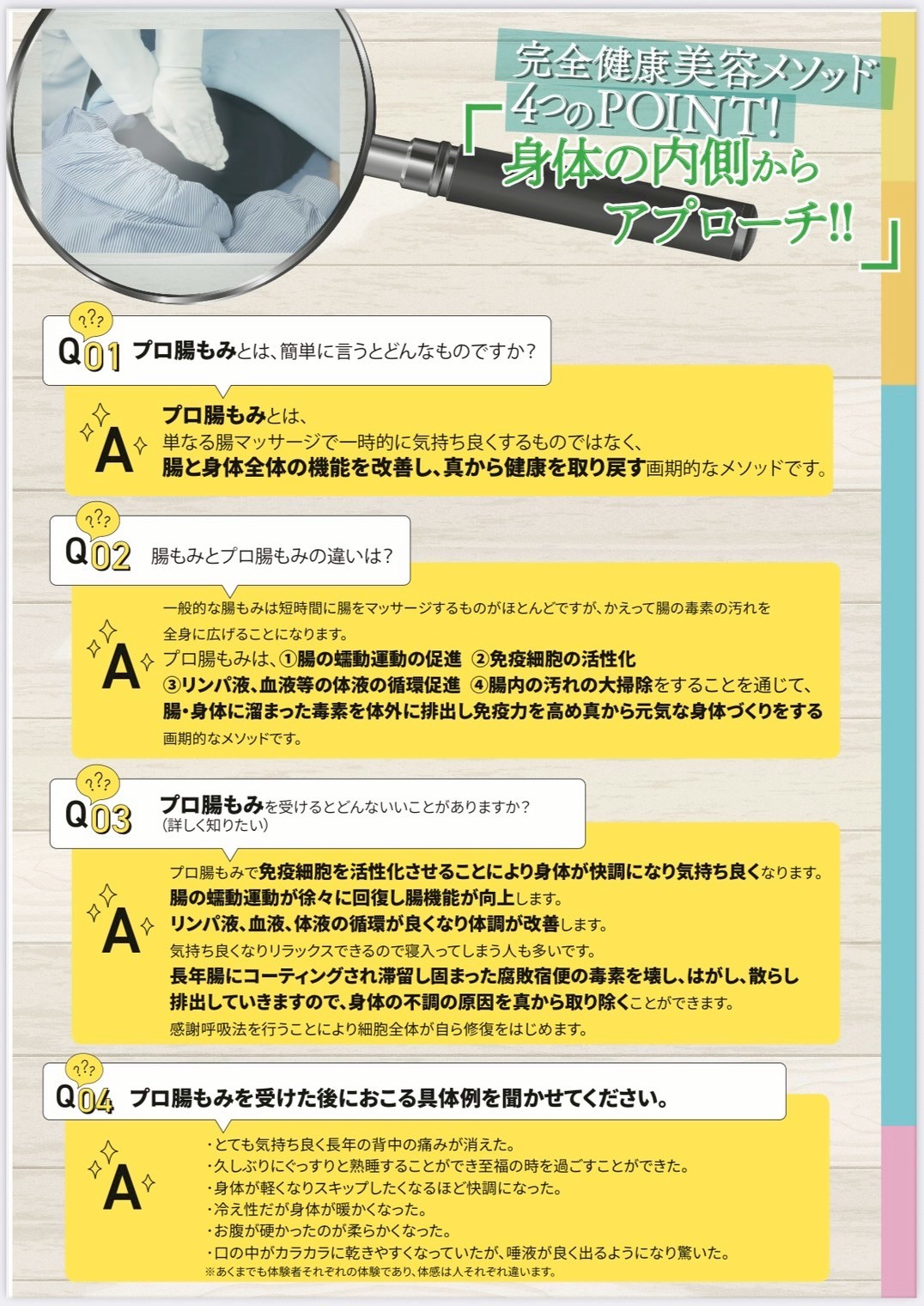 A. プロ腸もみの特徴は、体の内側からアプローチする点です。お腹の深い部分まで多種多様な手技で刺激することにより消化器系、免疫系に直接働きかけ、免疫機能、内臓機能の向上をサポートします。また、リラックス効果が高く、ストレス解消にも非常に有効です。